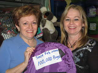 Evelyn and Wendy hold the 100,000th bag which is a back pack. Celebrate with us for sending 100,000 gift bags to 80 countries. Brenda Clark, Sherwood Park, Alberta and her team have sent 8000 of those bags to 20 countries.
