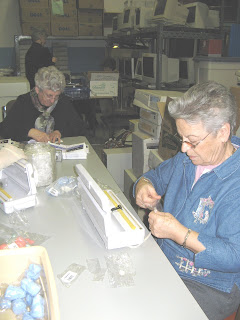 Carol, Fran, Betty, Delores and Val sort and organize an incoming shipment of hair accessories and school supplies.